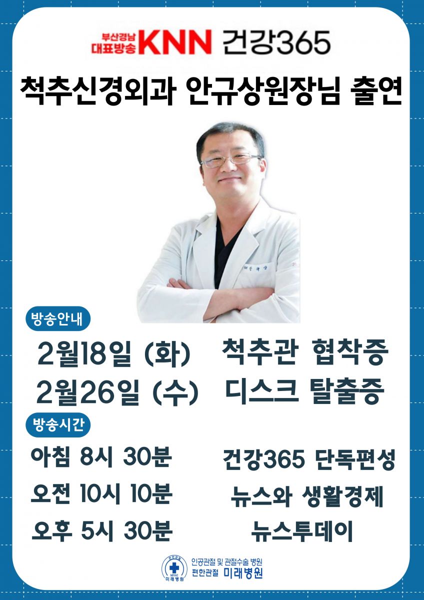 | Á¦¸ñ : ¹Ì·¡º´¿ø ¾È±Ô»ó ¿øÀå´Ô "KNN °Ç°365" 25³â 2¿ù18ÀÏ, 2¿ù26ÀÏ ¹æ¼Û Ã⿬ ¾È³» | ||||||